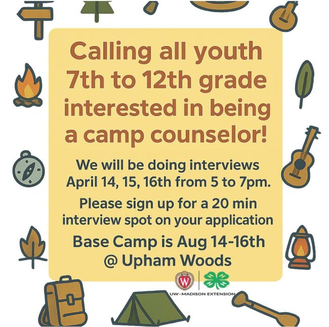 This year, camp staff will be required to fill out the online application, schedule their interview, and submit a resume to the Racine County 4-H Educator. Instructions are found in the online application and a resume outline can be found here! There will be a $30 counselor fee to cover the cost of food and lodging.