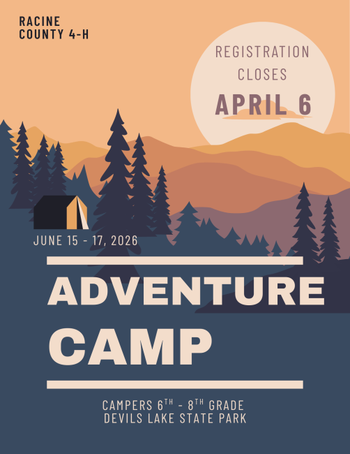 You can read all about the details on the registration form below! Adventure Camp is for Racine County 4-H campers in 6th – 8th grade during the 2025-26 school year. There will be a limit of 15 campers.