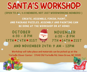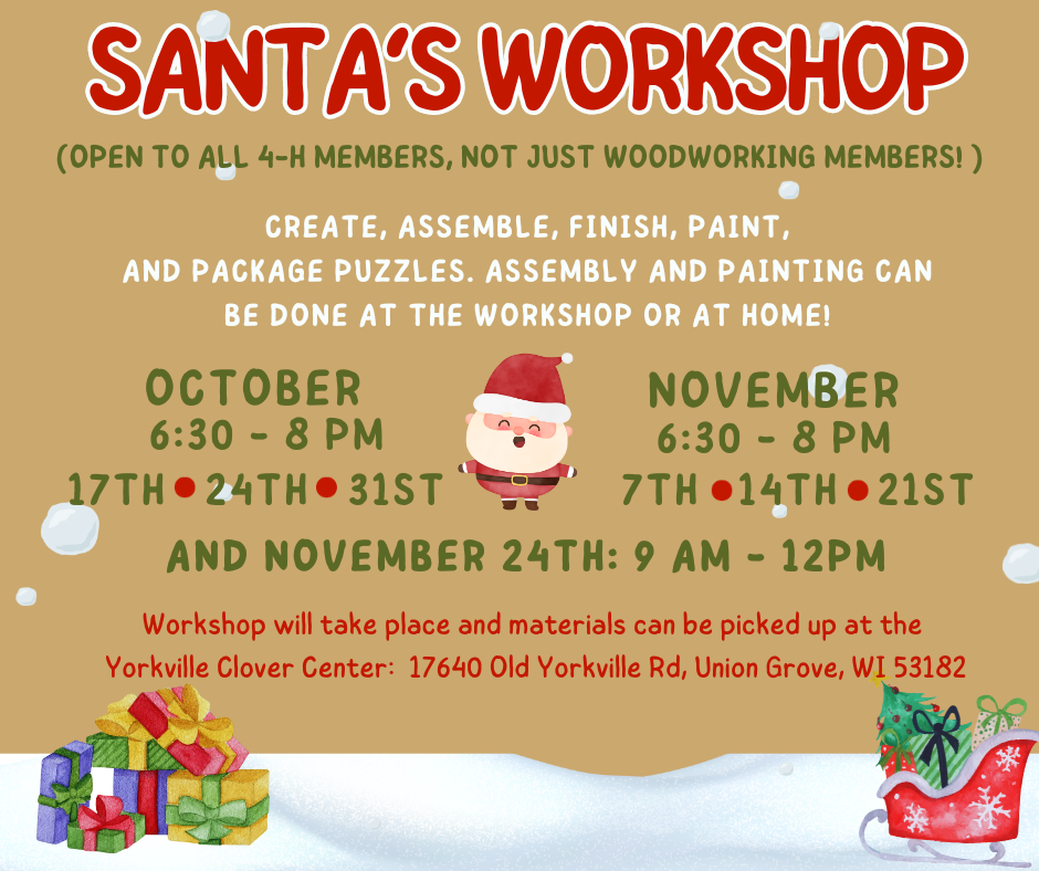 Santa’s Woodworking Workshop Share Share:Share on FacebookShare on X (Twitter) Share via EmailCopy LinkCopied! You are viewing information about a past event. Event Information Date November 22nd, 2016Time 6:30pm - 8:00pmSanta’s Woodworking Workshop Event LocationClover Center, Yorkville